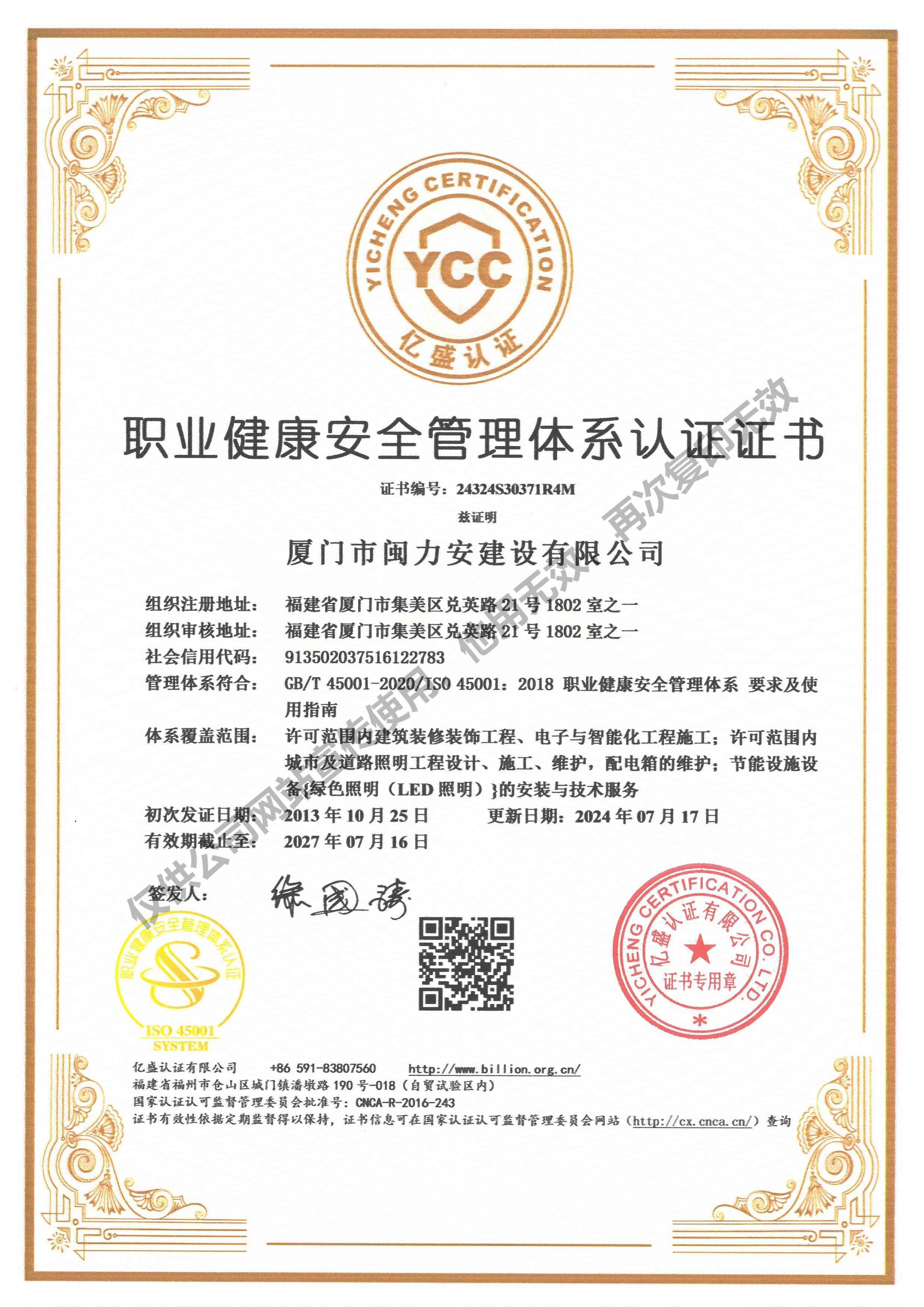 祝賀閩力安取得:職業健康安全管理體系認證證書